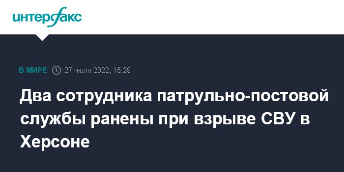 Москва. 27 июля. INTERFAX.RU - Два сотрудника патрульно-постовой службы получили в среду ранения в результате взрыва самодельного взрывного устройства в Херсоне, сообщил глава временной администрации области Владимир Сальдо.