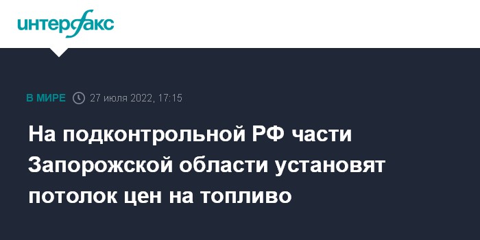 Москва. 27 июля. INTERFAX.RU - На территории Запорожской области, подконтрольной РФ, будут следить за качеством бензина и снизят цены на топливо, сообщил журналистам в среду глава временной администрации региона Евгений Балицкий.