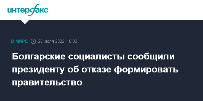 Москва. 28 июля. INTERFAX.RU - Представители Болгарской социалистической партии (БСП) в четверг известили президента страны Румена Радева об отказе от формирования нового правительства, сообщает Болгарское национальное радио.