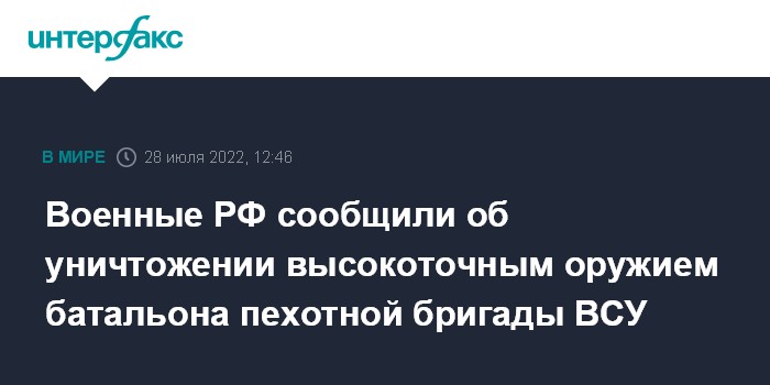 Москва. 28 июля. INTERFAX.RU - Минобороны РФ заявило об уничтожении высокоточным оружием батальона 60-й пехотной бригады ВСУ в Херсонской области.