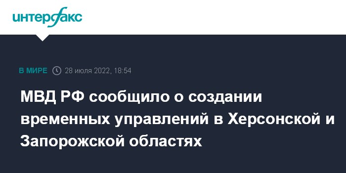 Москва. 28 июля. INTERFAX.RU - В МВД РФ объявили о формировании временных территориальных органов в Запорожской и Херсонской областях.