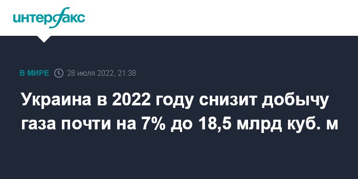 Москва. 28 июля. INTERFAX.RU - Украина планирует в 2022 году добыть 18,5 млрд куб. м газа, что на 6,6% (1,3 млрд куб. м) меньше, чем в 2021 году, сообщил заместитель министра энергетики Николай Колесник.