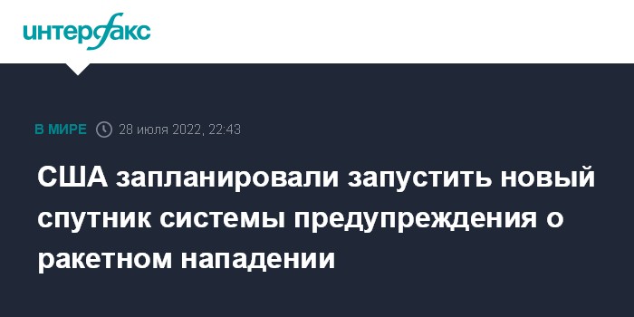 Москва. 28 июля. INTERFAX.RU - Очередной американский спутник системы предупреждения о ракетном нападении (СПРН) SBIRS нового поколения GEO 6 планируется запустить на орбиту 4 августа, сообщила компания-оператор United Launch Alliance (ULA).