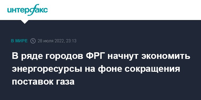 Москва. 28 июля. INTERFAX.RU - Власти ряда городов Германии приняли решение ввести ряд мер, направленных на экономию энергоресурсов, на фоне сокращения поставок газа в Европу, сообщают европейские СМИ.