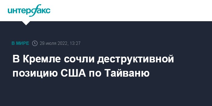 Москва. 29 июля. INTERFAX.RU - В Кремле заявили о солидарности с позицией Пекина по тайваньскому вопросу и об уважении суверенитета и территориальной целостности Китая, а также назвали деструктивной позицию США по данной проблеме.
