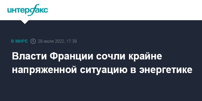 Москва. 29 июля. INTERFAX.RU - Официальный представитель правительства Франции Оливье Веран озвучил меры, предпринимаемые властями с целью противостоять ситуации в энергетическом секторе, которую он расценил как крайне напряженную.