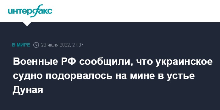 "28 июля 2022 г. при промере глубин фарватера в устье реки Дунай произошел подрыв малого географического судна "Шляхович" (государственной гидрографической службы Украины) на украинской дрейфующей мине", - сказал Мизинцев на брифинге в пятницу.