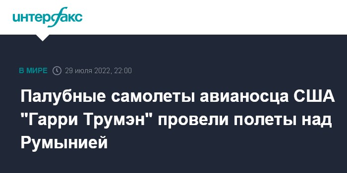 Москва. 29 июля. INTERFAX.RU - Палубные самолеты радиоэлектронной борьбы EA-18 ВМС США с авианосца Harry Truman, находящегося в Средиземном море, провели учебные полеты в воздушном пространстве Румынии, сообщили в пятницу в НАТО.