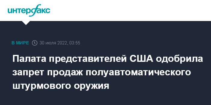 Москва. 30 июля. INTERFAX.RU - Палата представителей американского Конгресса одобрила законопроект о восстановлении запрета на продажи полуавтоматического оружия после серии массовых расстрелов в стране, сообщило агентство Associated Press (АР).