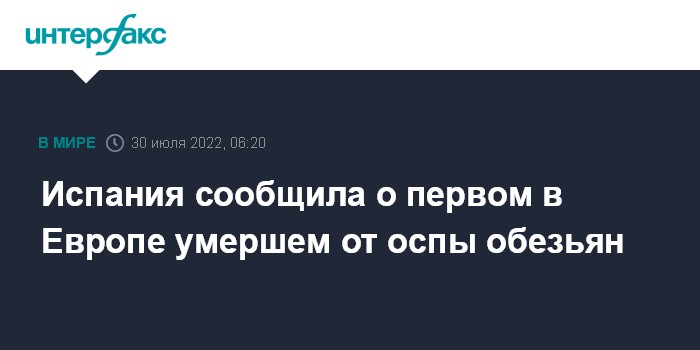 Москва. 30 июля. INTERFAX.RU - Один человек скончался от оспы обезьян в Испании, это первая смерть от этой инфекции, зарегистрированная в Европе, сообщает La Vanguardia со ссылкой на отчет испанского Министерства здравоохранения.