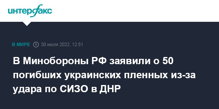 Москва. 30 июля. INTERFAX.RU - В результате ракетного удара по следственному изолятору в районе Еленовки погибли 50 украинцев, тяжелые ранения получили 73 военнопленных, сообщил официальный представитель министерства обороны РФ Игорь Конашенков на брифинге в субботу.