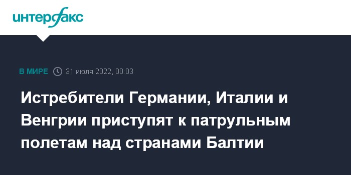 Москва. 30 июля. INTERFAX.RU - Не менее 12 истребителей из Германии, Италии и Венгрии с 1 августа приступят к патрулированию воздушного пространства над странами Балтии, сообщает в субботу пресс-служба НАТО.