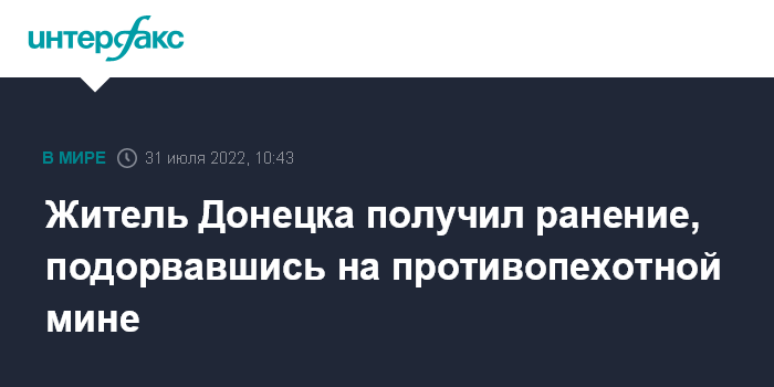 Москва. 31 июля. INTERFAX.RU - В Донецке мирный житель подорвался на запрещенной противопехотной мине "Лепесток", сообщает совместный центр контроля и координации режима прекращения огня (СЦКК) Донецкой народной республики.