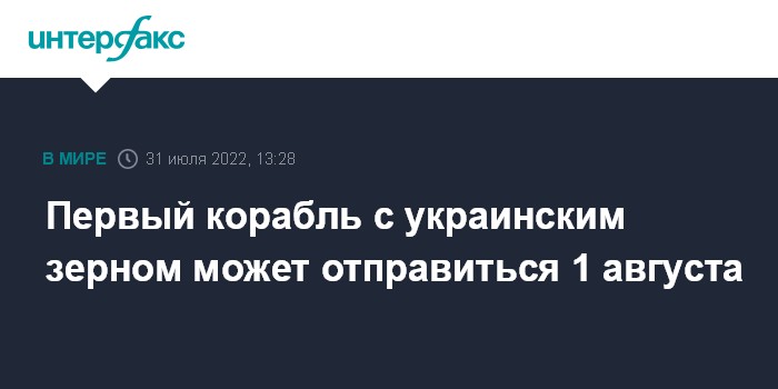 Москва. 31 июля. INTERFAX.RU - Первое судно с зерном может покинуть Украину 1 августа, передают турецкие СМИ в воскресенье со ссылкой на слова представителя президента Турции Ибрагима Калына.