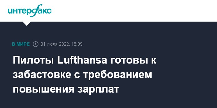 Москва. 31 июля. INTERFAX.RU - Практически все пилоты немецкой авиакомпании Lufthansa, состоящие в профсоюзе, заявили о готовности выйти на забастовку с требованием повышения зарплат, передает в воскресенье агентство Associated Press со ссылкой на заявление профсоюза.