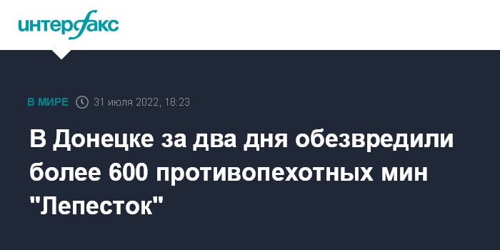 Москва. 31 июля. INTERFAX.RU - Более 600 запрещенных противопехотных мин "Лепесток" обезврежены за 2 дня в Донецке, сообщает МЧС Донецкой народной республики.