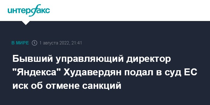 Москва. 1 августа. INTERFAX.RU - Бывший управляющий директор группы "Яндекс" Тигран Худавердян подал в суд Евросоюза иск об отмене санкций против него, говорится в официальном журнале ЕС.