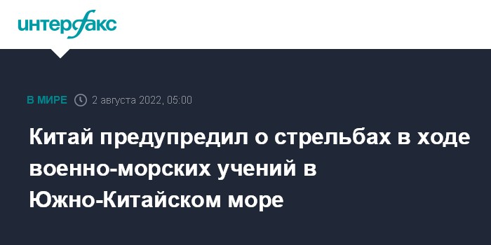 Москва. 2 августа. INTERFAX.RU - Управление морской безопасности Китая распространило уведомление о том, что с 00:00 часов 2 августа до 00:00 часов 6 августа в части акватории Южно-Китайского моря будут проводиться военные учения с боевыми стрельбами.
