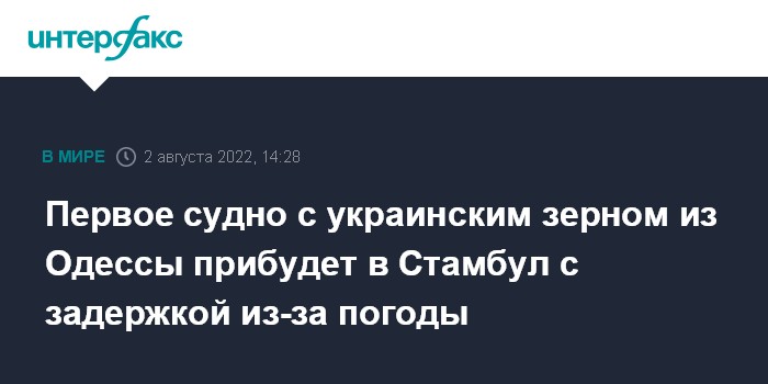 Москва. 2 августа. INTERFAX.RU - Первое судно с украинским зерном, которое в минувший понедельник покинуло порт Одессы, прибудет в Стамбул позже, чем планировалось - к полуночи, сообщает во вторник агентство Anadolu со ссылкой на турецкого генерала Озджана Алтунбулака.