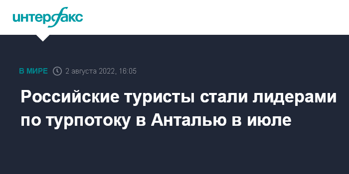 "Согласно статистике, число туристов, прилетевших в Анталью с 1 января по 30 июля 2022 года, выросло на 97% по сравнению с аналогичным периодом прошлого года и составило 6,68 млн человек. В июле только воздушным транспортом в Анталью прибыли 2,4 млн иностранных гостей", - говорится в публикации.