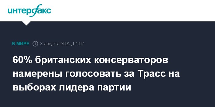 Москва. 3 августа. INTERFAX.RU - Как минимум 60% членов Консервативной партии Великобритании собираются поддержать министра иностранных дел Лиз Трасс на предстоящих выборах лидера партии и, соответственно, премьер-министра страны, сообщает Sky News со ссылкой на опрос компании YouGov.
