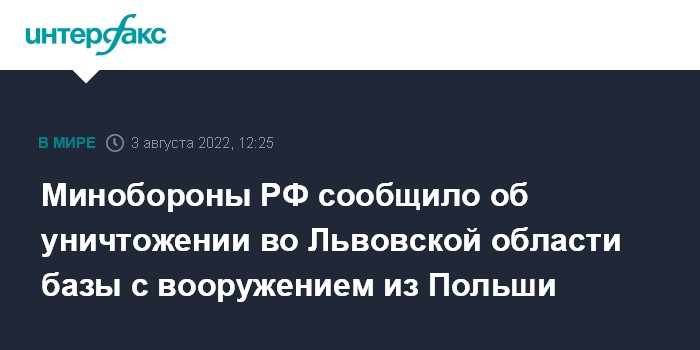 Москва. 3 августа. INTERFAX.RU - Российские военные ракетами большой дальности уничтожили во Львовской области базу хранения с поступившим украинской армии из Польши вооружением и боеприпасами иностранного производства, сообщил официальный представитель министерства обороны РФ Игорь Конашенков на брифинге в среду.