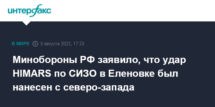 Москва. 3 августа. INTERFAX.RU - Удар реактивной системой залпового огня американского производства HIMARS по СИЗО с украинскими военнопленными в Еленовке был нанесен с северо-западного направления, сообщил в среду замминистра обороны РФ Александр Фомин.