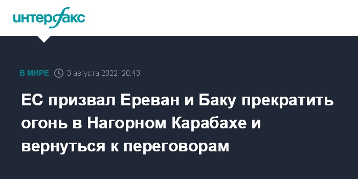 Москва. 3 августа. INTERFAX.RU - Власти ЕС призывают стороны конфликта в Нагорном Карабахе немедленно положить конец боевым действиям и возобновить переговоры, говорится в заявлении европейской внешнеполитической службы.