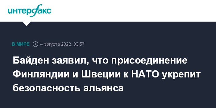Москва. 4 августа. INTERFAX.RU - Президент США Джо Байден приветствовал голосование Сената по вступлению в НАТО Финляндии и Швеции, заявив, что их членство в альянсе будет способствовать укреплению коллективной безопасности.