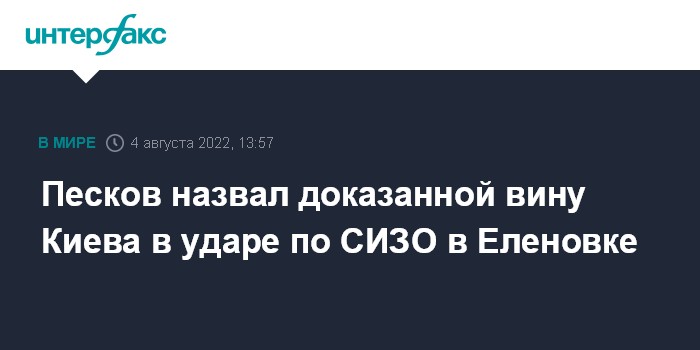 Москва. 4 августа. INTERFAX.RU - Вина Украины в ударе по СИЗО с украинскими военными в Еленовке очевидна и доказана, заявил на брифинге пресс-секретарь президента России Дмитрий Песков.
