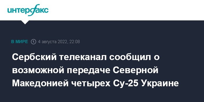 Москва. 4 августа. INTERFAX.RU - Северная Македония передала Украине четыре истребителя Су-25, однако о том, где именно они находятся сейчас, не сообщается, сообщил сербский телеканал РТС.