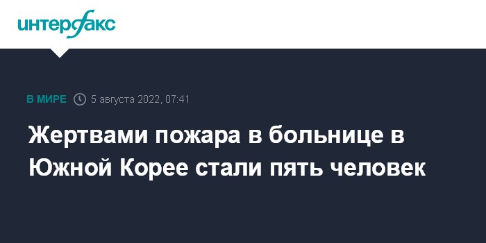 Москва. 5 августа. INTERFAX.RU - Пять человек погибли и 37 пострадали в результате пожара в больнице в южнокорейском городе Инчхон, сообщает "Ренхап".