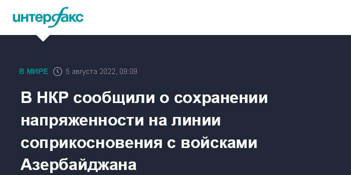 Москва. 5 августа. INTERFAX.RU - Министерство обороны непризнанной Нагорно-Карабахской республики (НКР) сообщает о напряженной ситуации на линии соприкосновения с войсками Азербайджана.
