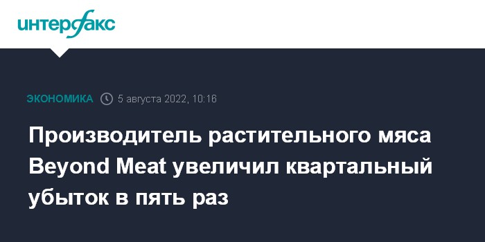 Москва. 5 августа. INTERFAX.RU - Американский производитель растительных заменителей мяса Beyond Meat увеличил чистый убыток во втором квартале 2022 финансового года (завершился 23 июля) почти в пять раз, при этом показатель оказался хуже прогнозов аналитиков.