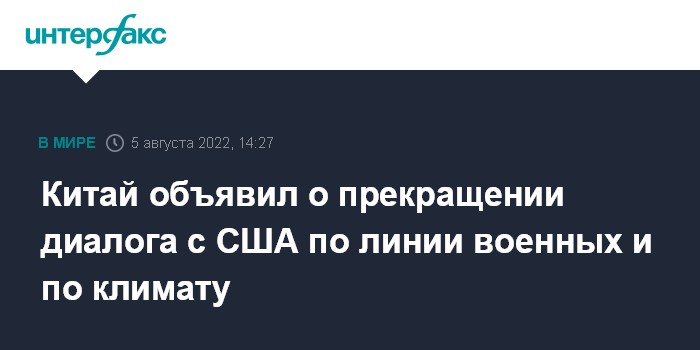 Москва. 5 августа. INTERFAX.RU - Власти Китая объявили о приостановке или прекращении диалога с США по нескольким вопросам в связи с визитом спикера Палаты представителей США Нэнси Пелоси на Тайвань, сообщает в пятницу Bloomberg.