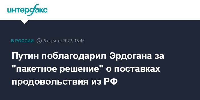 Москва. 5 августа. INTERFAX.RU - Президент РФ Владимир Путин поблагодарил турецкого коллегу Реджепа Тайипа Эрдогана за посредничество в решении вопроса о поставках украинского зерна и достижении "пакетного решения" по экспорту российского продовольствия и удобрений.