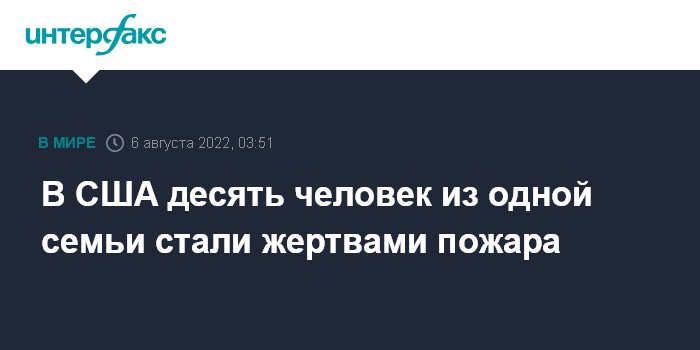 Москва. 6 августа. INTERFAX.RU - В американском штате Пенсильвания десять человек погибли в результате пожара в двухэтажном частном доме, среди них было трое детей, сообщает Associated Press.