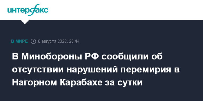 Москва. 6 августа. INTERFAX.RU - Российские миротворцы за сутки не зафиксировали нарушений режима прекращения огня в Нагорном Карабахе, сообщили в Минобороны РФ в субботу.