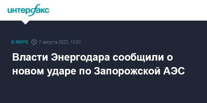 Москва. 7 августа. INTERFAX.RU - Вооруженные силы Украины нанесли ракетный удар по территории Запорожской АЭС, сообщили журналистам в воскресенье в пресс-службе администрации Энергодара, который находится на подконтрольной РФ части области.
