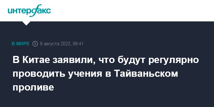 Москва. 8 августа. INTERFAX.RU - Китайские государственные СМИ в воскресенье объявили, что, хотя четырехдневные военные учения закончились, Народно-освободительная армия (НОАК) начнет проводить "регулярные" военные учения к востоку от срединной линии Тайваня.