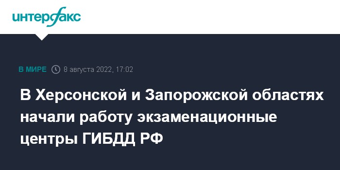 Москва. 8 августа. INTERFAX.RU - Регистрационно-экзаменационные центры российской Госавтоинспекции начали работу в Херсонской области с 6 августа, на подконтрольной России части Запорожской области - с 8 августа, сообщает МВД России.