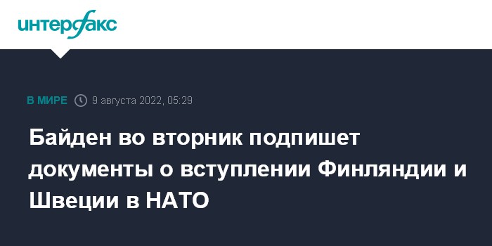 Москва. 9 августа. INTERFAX.RU - Президент США Джо Байден во вторник подпишет документы, необходимые для вступления Финляндии и Швеции в НАТО, следует из графика американского лидера, опубликованного Белым домом.