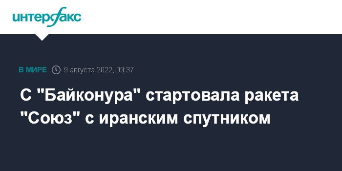 Москва. 9 августа. INTERFAX.RU - Ракета "Союз-2.1б", которая должна вывести на орбиту иранский спутник "Хайям" и 16 малых спутников, стартовала с космодрома "Байконур", следует из трансляции "Роскосмоса".