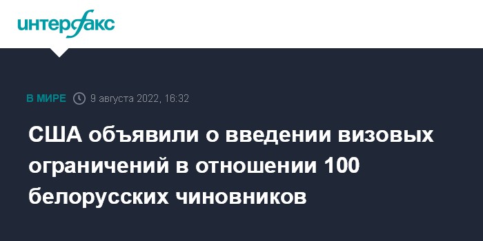 Москва. 9 августа. INTERFAX.RU - Госдеп США во вторник объявил о введении в отношении 100 белорусских официальных лиц ограничений за "участие в подрыве демократических институтов" в Белоруссии.