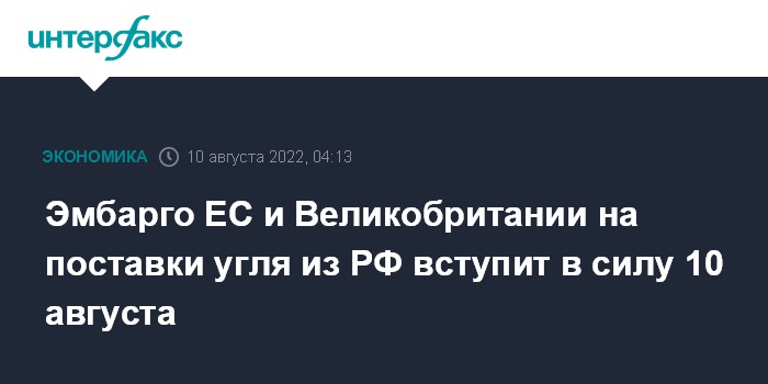 Также запрет на импорт угля из РФ с 10 августа вводит Великобритания.