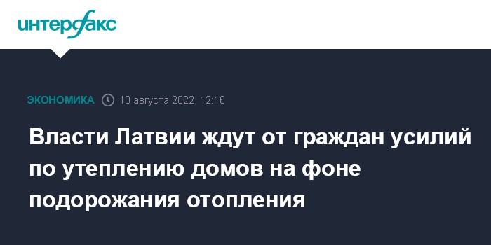 9 августа правительство Латвии одобрило изменения в закон о мерах по уменьшению влияния чрезвычайного роста цен на энергоресурсы, предусматривающие, в том числе, компенсацию затрат домашних хозяйств на теплоснабжение. Общая сумма поддержки увеличивается с первоначально предполагавшихся 350 млн евро до 442,25 млн евро.