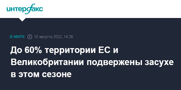Москва. 10 августа. INTERFAX.RU - Примерно 60% территории ЕС и Британии в этом году испытывают на себе последствия засухи, которые усугубляет аномальная жара. Об этом сообщил в среду портал Axios со ссылкой на европейскую Службу мониторинга атмосферы "Коперник".