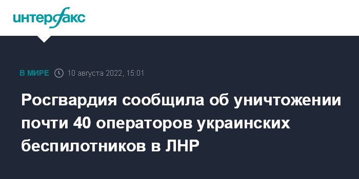 Москва. 10 августа. INTERFAX.RU - В Росгвардии сообщили об уничтожении 39 операторов украинских беспилотников на территории Луганской народной республики.
