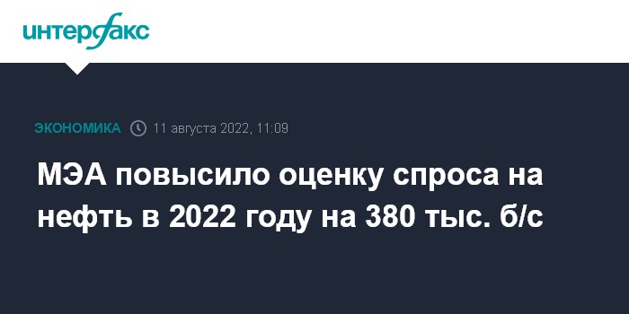 Москва. 11 августа. INTERFAX.RU - Международное энергетическое агентство (МЭА) повысило на 380 тыс. б/с прогноз роста спроса на нефть в 2022 году, следует из ежемесячного отчета агентства.