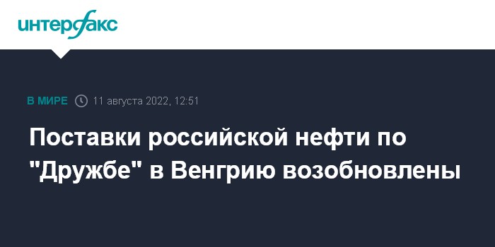 Москва. 11 августа. INTERFAX.RU - Поставки российской нефти в Венгрию по трубопроводу "Дружба" возобновлены ночью со среды на четверг, сообщило министерство технологий и промышленности Венгрии.